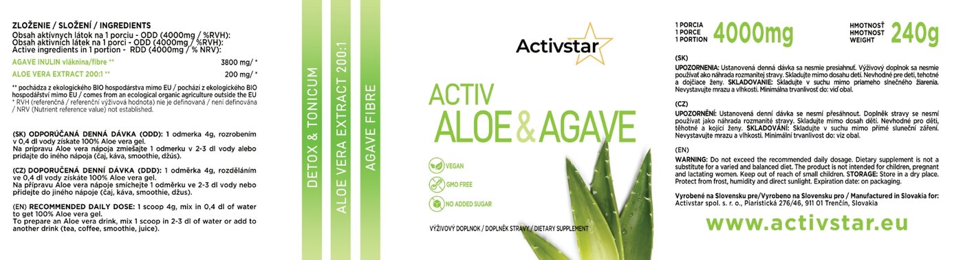 Dawkowanie: 1 miarka 4 g rozcieńczona w 0,4 dl wody w celu uzyskania 100% aloesu, 60 porcji - 18 litrów napoju.