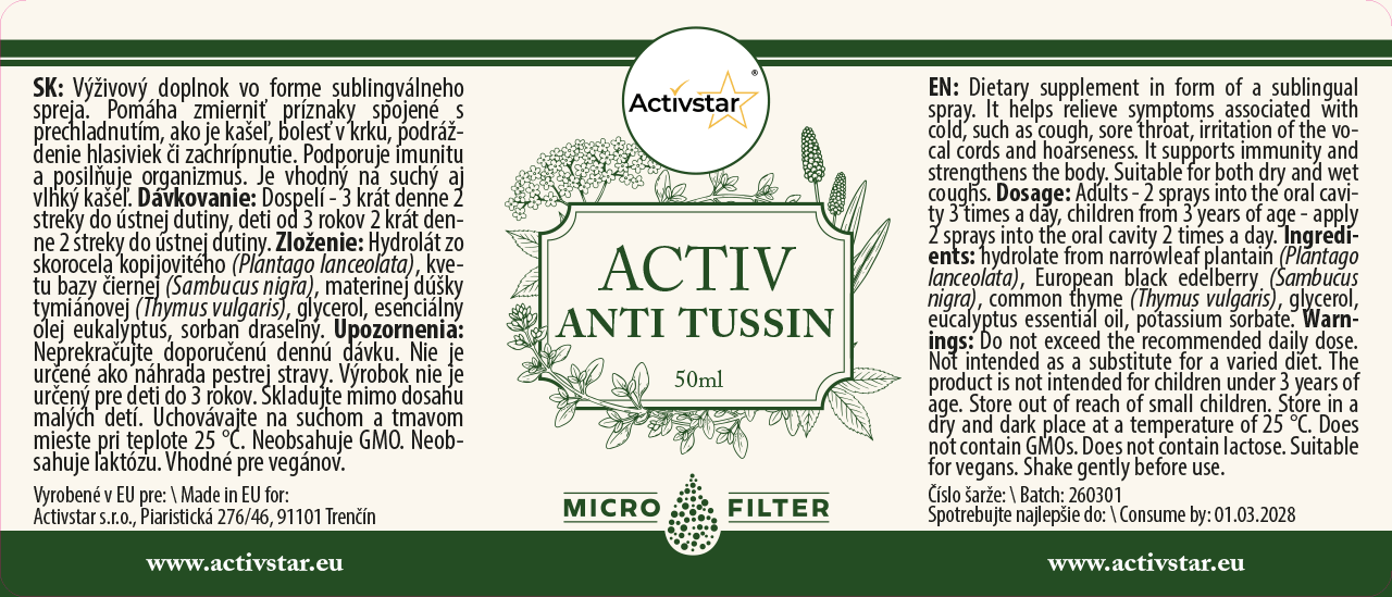 ACTIV ANTI TUSSIN to suplement diety w postaci podjęzykowego sprayu, który pomaga łagodzić nieprzyjemne objawy związane z przeziębieniem. Wspiera odporność, koi podrażnione gardło i przyczynia się do ogólnej ochrony organizmu.