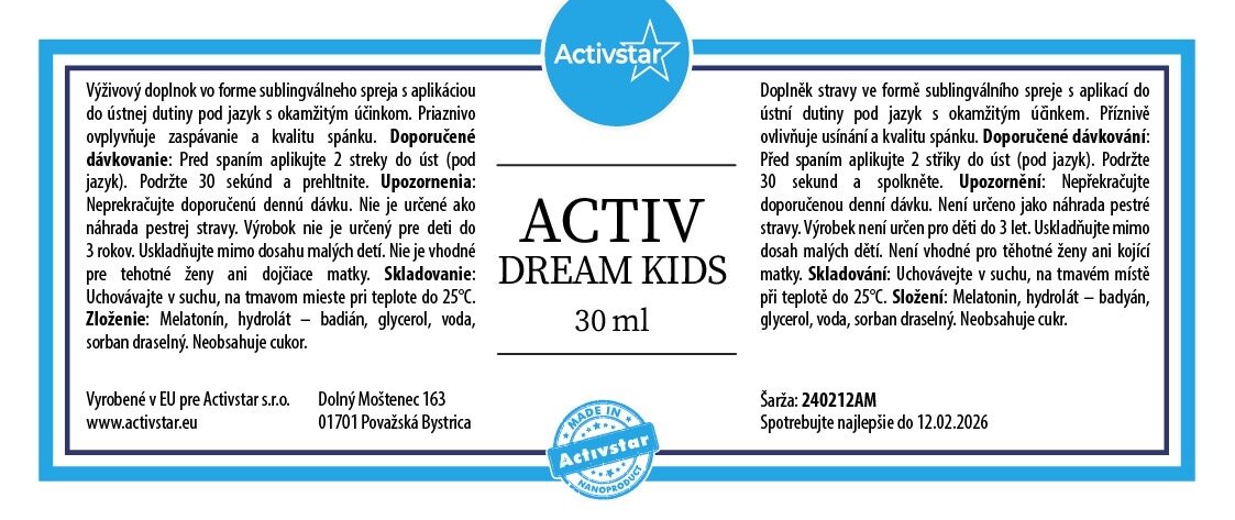 Spray podjęzykowy jest doskonałą alternatywą dla kapsułek i tabletek, nie obciąża układu trawiennego dziecka, a efekt jest niemal natychmiastowy.Są przeznaczone dla wszystkich dzieci od 3 roku życia i nie zawierają GMO (organizmów modyfikowanych genetycznie), laktozy ani cukru.ACTIV DREAM KIDS ma przyjemny smak anyżu gwiazdkowatego.