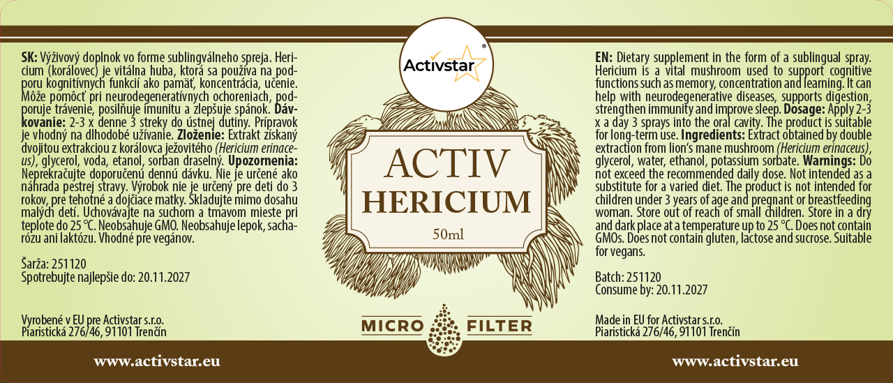 Activ Hericium to suplement diety w postaci sprayu podjęzykowego, który zawiera ekstrakt z grzyba witalnego Hericium erinaceus (Jeż Koralowy). Dzięki unikalnej technologii podwójnej ekstrakcji zapewnia maksymalną skuteczność i szybkie wchłanianie bezpośrednio przez błony śluzowe.