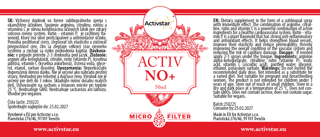 ACTIV NO+ to suplement diety w formie podjęzykowego sprayu o natychmiastowym działaniu. Połączenie argininy, cytruliny, rutyny i witaminy C to niezwykle silna kombinacja składników aktywnych, które wspierają zdrowie naczyń krwionośnych, mikrokrążenie i ogólną sprawność układu sercowo-naczyniowego.