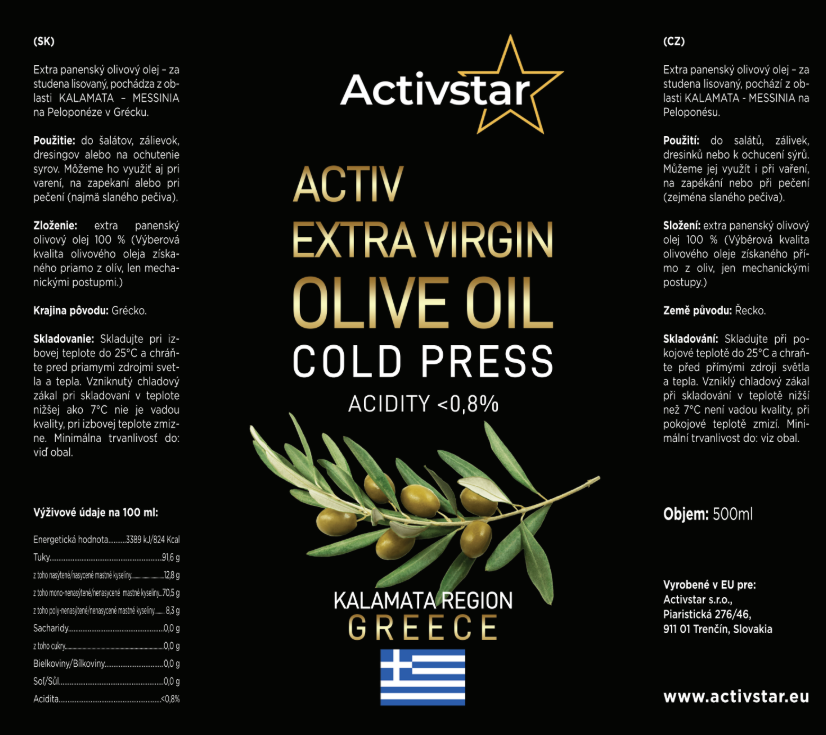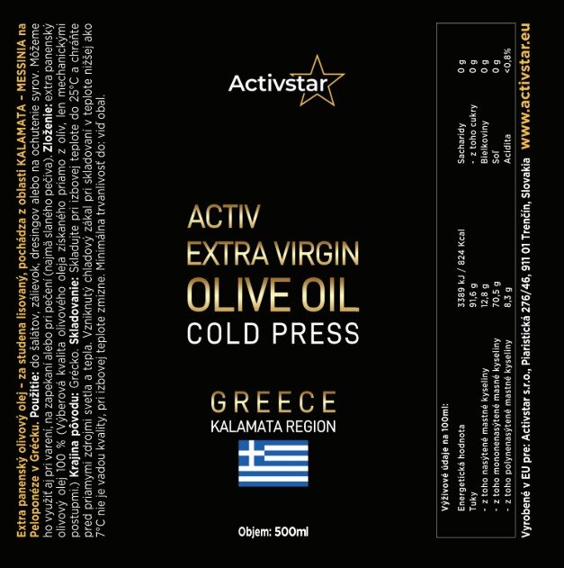 Odkryj Activstar Extra Virgin Olive Oil z regionu Kalamata - w 100% naturalną, tłoczoną na zimno, bez chemii. Bogaty owocowy smak, pełen przeciwutleniaczy i zdrowych tłuszczów. Doskonała do sałatek, gotowania i pieczenia.