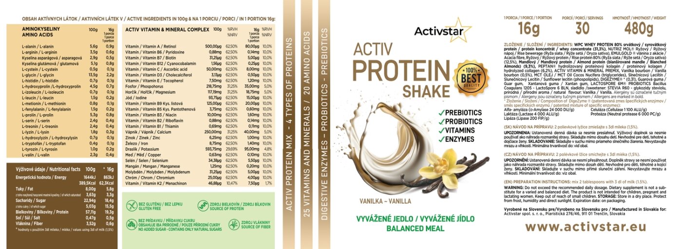 poprawić swoje zdrowie i utrzymać energię przez cały dzień. A wszystko to w pysznym waniliowym smaku, który zachwyci Twoje podniebienie. Activ Protein Shake Vanilla to coś więcej niż napój białkowy - to Twój nowy sprzymierzeniec na drodze do lepszej kondycji, zdrowia i witalności!