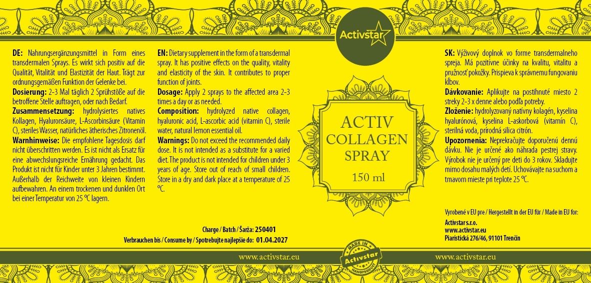Activcollagen spray zawiera hydrolizowany kolagen w formie sprayu, który szybko się wchłania i odżywia organizm.