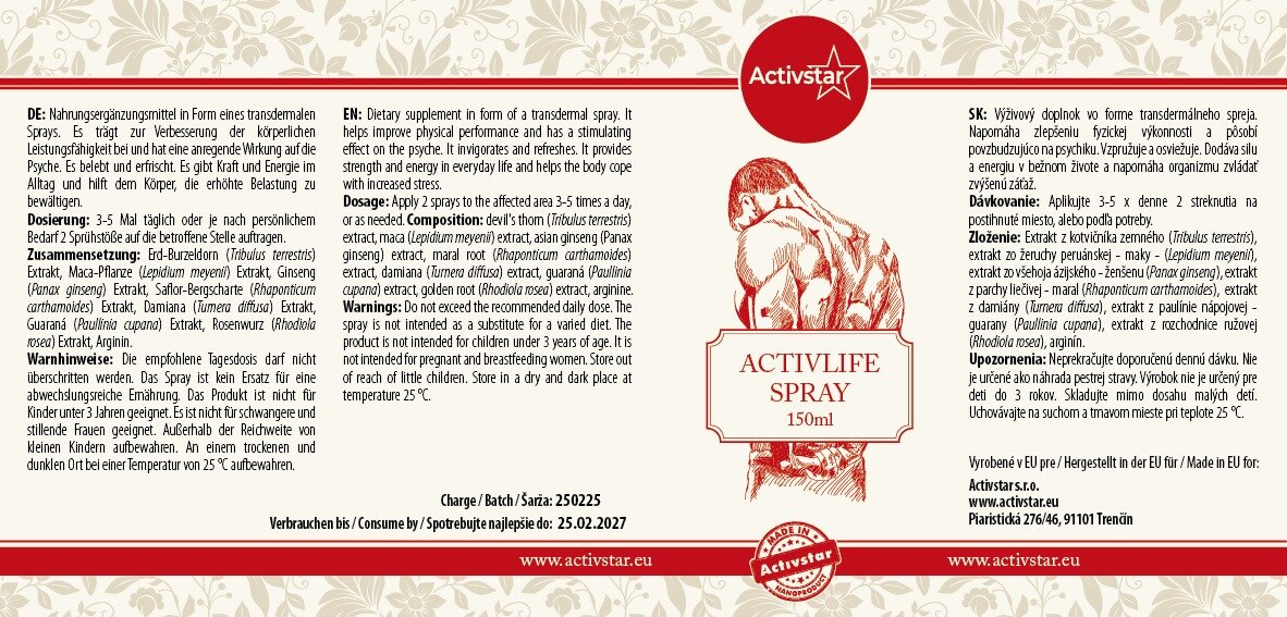 Składniki: Ekstrakt z buzdyganka naziemnego (Tribulus terrestris), ekstrakt z peruwiańskiej rukwi wodnej - maki - (Lepicum meyeniii), ekstrakt z żeń-szenia azjatyckiego - (Panax ginseng), ekstrakt z maruny leczniczej (Phaponticum carthamoides), ekstrakt z damiany (Turnera diffusa), ekstrakt z guarany (Paulinia cupana), ekstrakt z różeńca górskiego (Rhodiola rosea), arginina.